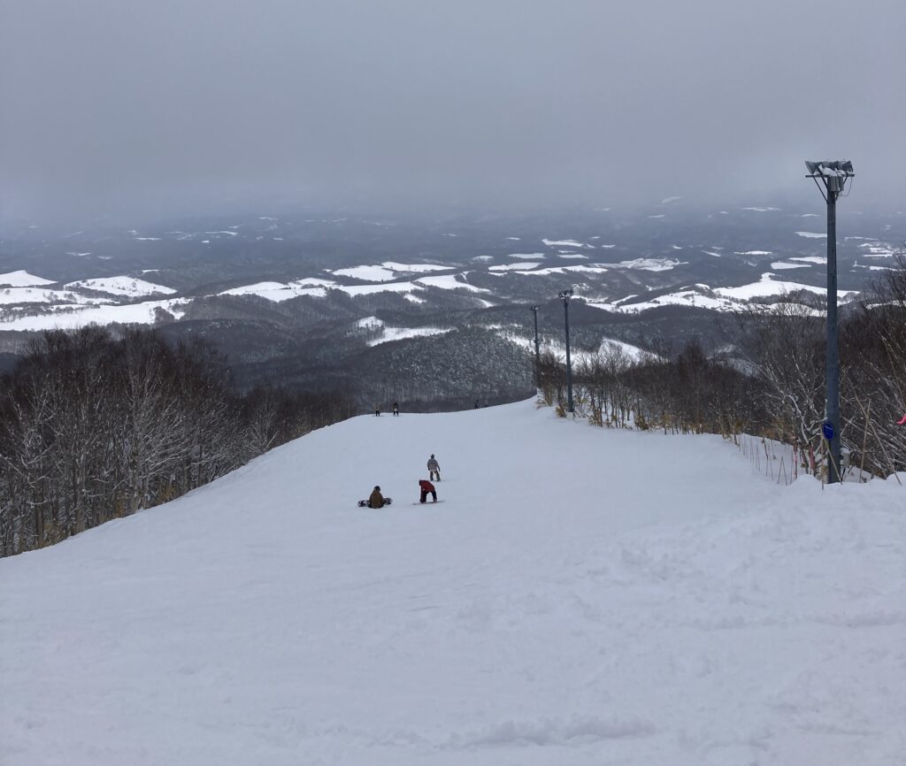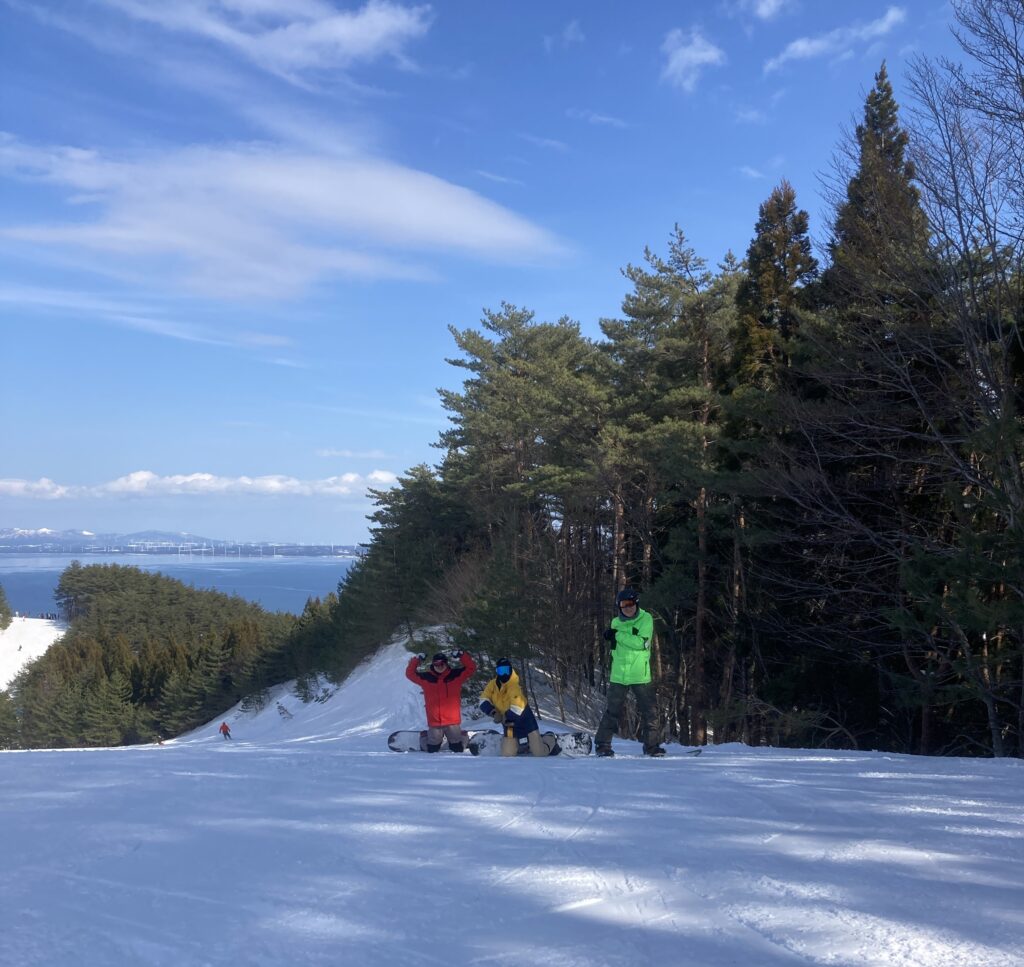 はじめての、一人でのスノーボード。地元の子供たちに混ざって、カービングの練習をしました。