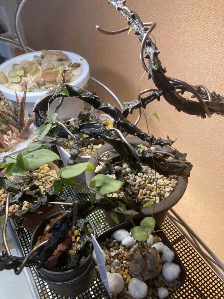 2025/7/2 写真じゃわかりづらいですが、葉も緑に色づいて、蔓も旺盛に伸びています。夏になりましたが、この部屋は一日中冷房をつけっぱなしなので(海水魚飼育のためですが…)、ちょうどよい温度になっているみたいです。