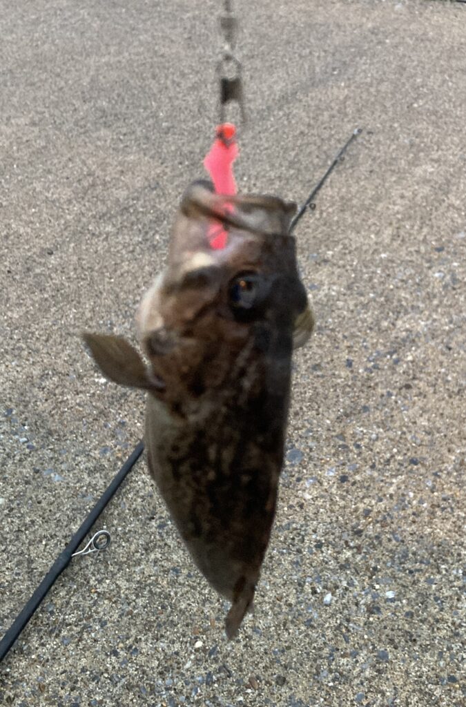 うちは離れた場所で投げてみます。虫ヘッド&イソメで初めての釣果ですが、残念ながらフグなので、リリースします。ブラクリで、小さめのアイナメ(?)も釣れました。