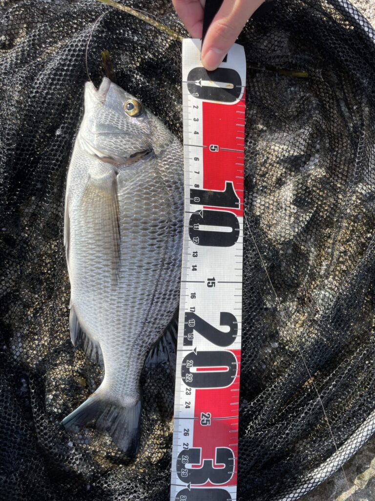 ついにチヌが釣れました!イソメぶっこみです。本心はかご釣りで釣りたかったですが、別の竿にヒット。かごで撒いたオキアミに寄ってきたと信じましょう。今年はチヌがよく釣れているらしく、周りでも小さいチヌが何匹か上がっていました。