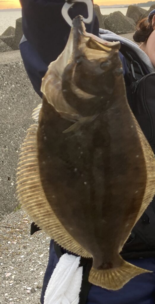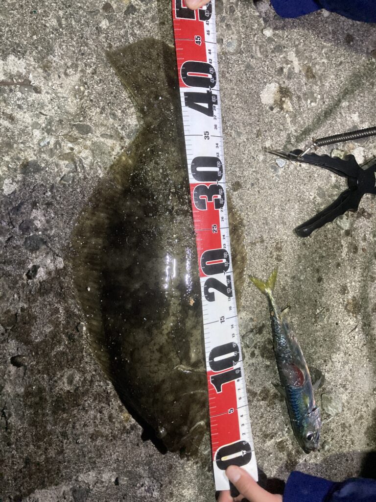 敗戦の理由は、無理に巻きすぎたことだと思います。ラインが切れたのか、針の結び目が解けたのかわかりませんが、ばらしてしまいました。。。その後は当たりなく、意気消沈。最後まで泳がせをしている竿にも反応がありません。地元のおいちゃんに釣り方を教わったので、次こそはリベンジしようと心に決めて、特に当りもない竿を引き上げたところ…なんとラストチャンスでヒラメがかかっていました。重さもあまり感じなかったので抜き上げました。測ってみると45cmで中々の大きさ。バラエティー番組ばりのドラマチックな釣行となりました。