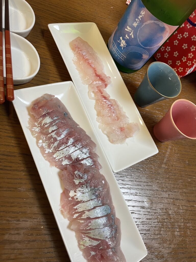 一方で、フカセ釣りにはグレが2匹ヒット。どちらも義父が釣りました。20cmそこそことサイズもよし。釣りを楽しんでもらえたと思います。前日の飲み&カラオケを控えたのが功を奏しました。刺身で食べましたが、非常においしく、人気ターゲットの理由がわかりました。