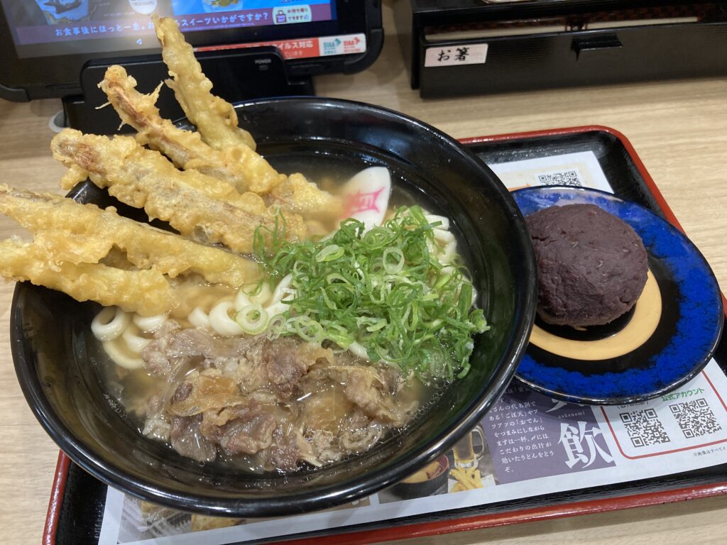 まずは、資さんうどんに行ってみました。一番人気(?)の肉ごぼ天うどん&牡丹餅。旨味が濃いめで、ごぼてんでリセットする感じ。