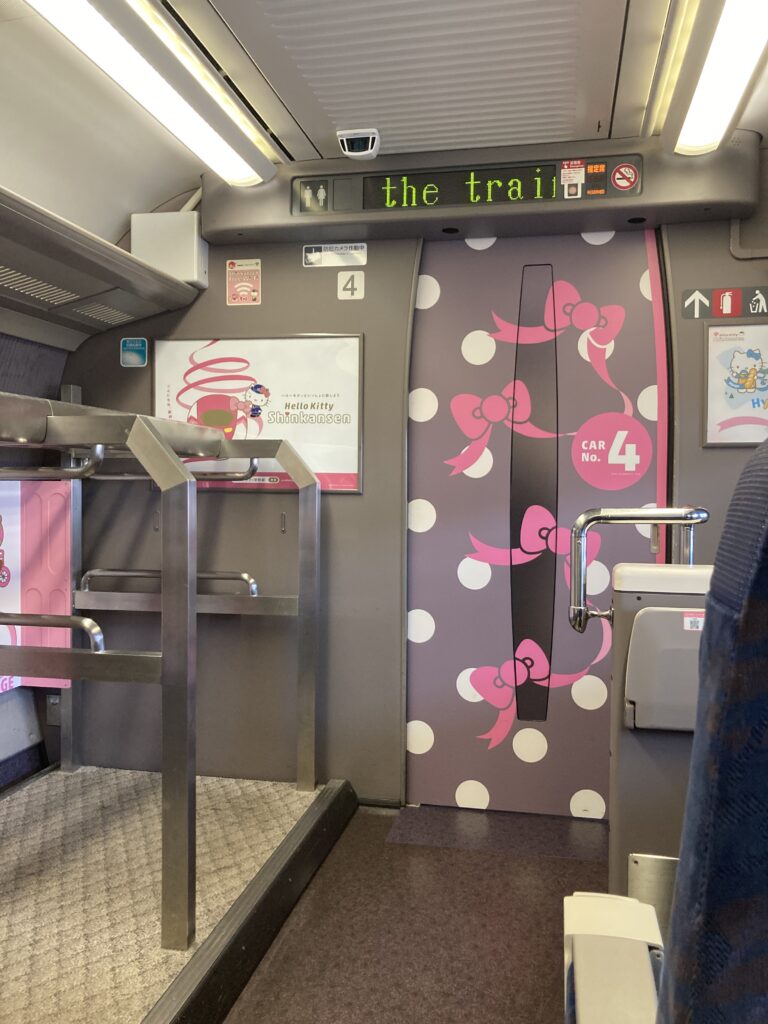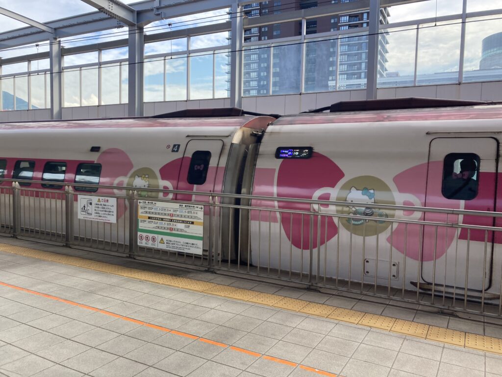小倉から博多に移動するのに、適当な新幹線を選んだら、なんとハローキティ新幹線なるものに乗車できました。外装・内装ともに可愛らしく、癒されます。